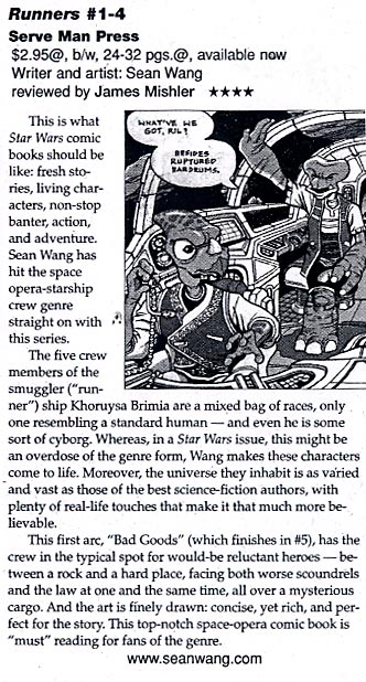 "It's quite easy to say that Runners is one the most entertaining comic books on shelves today. The story, humor, and artwork of Sean Wang places him in a league of his own amongst his rivals in the independent comic book market."