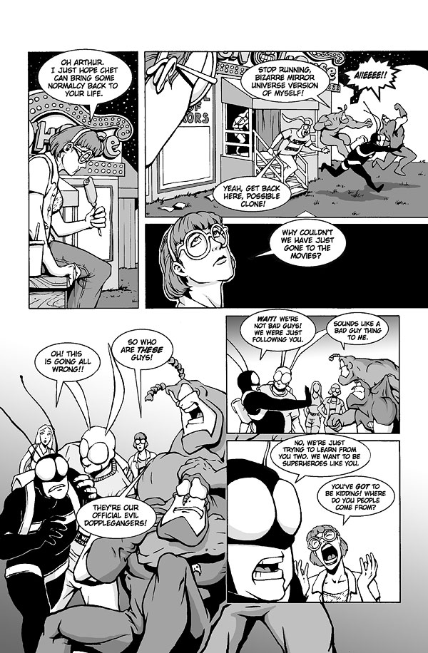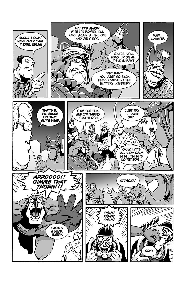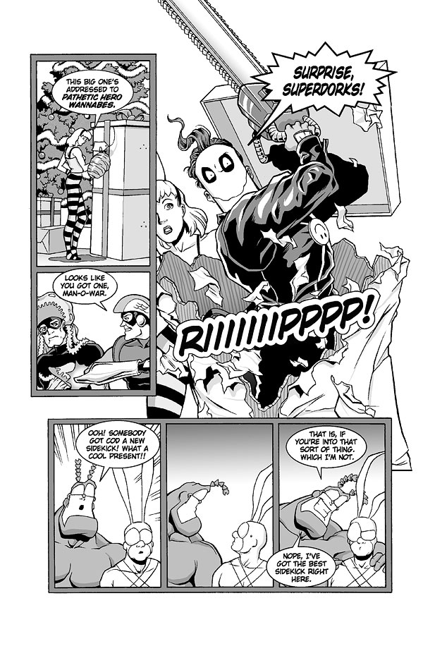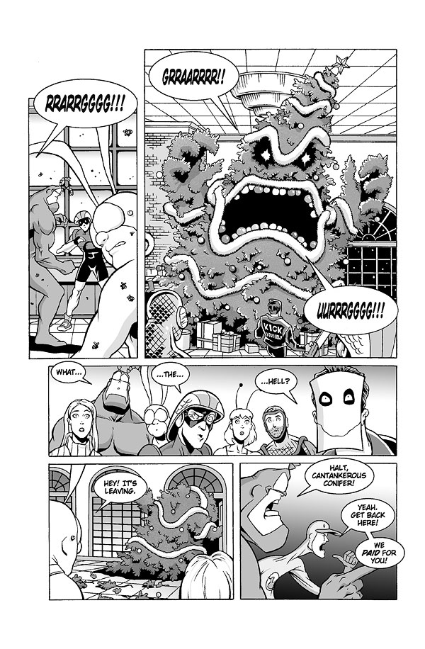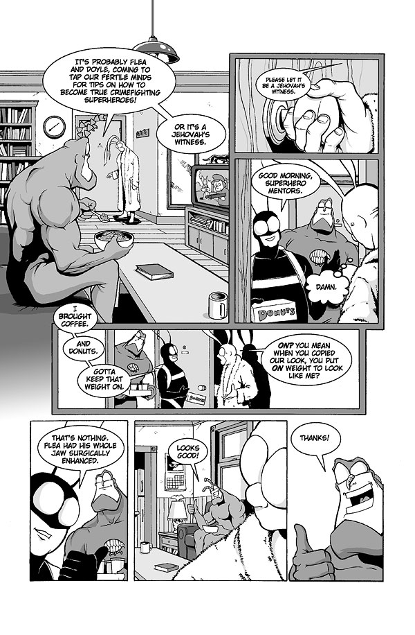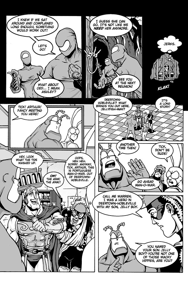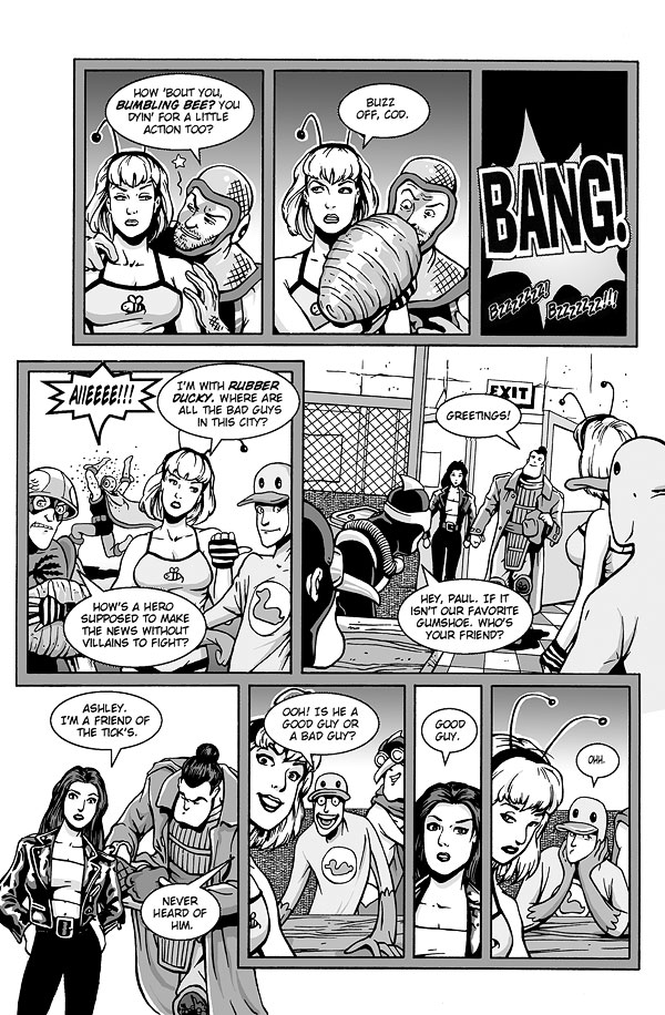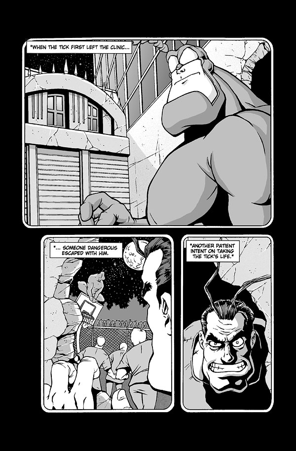 In 1999, I moved on to the six-issue Tick & Arthur series, where I was able to play with longer narratives and more story continuity (although even the seasonal specials had plot elements that all tied together). I added grayscale to the art to help flesh out the black-and-white look of the book, a look that eventually carried over to the first Runners series. I still love the work I did on Tick & Arthur, since I think the stories and art are a lot of fun and also add some layers to the Tick universe.
