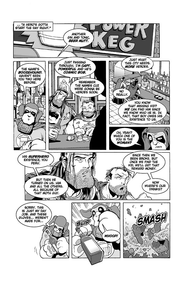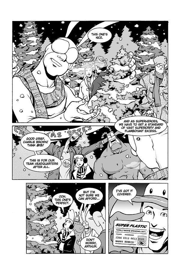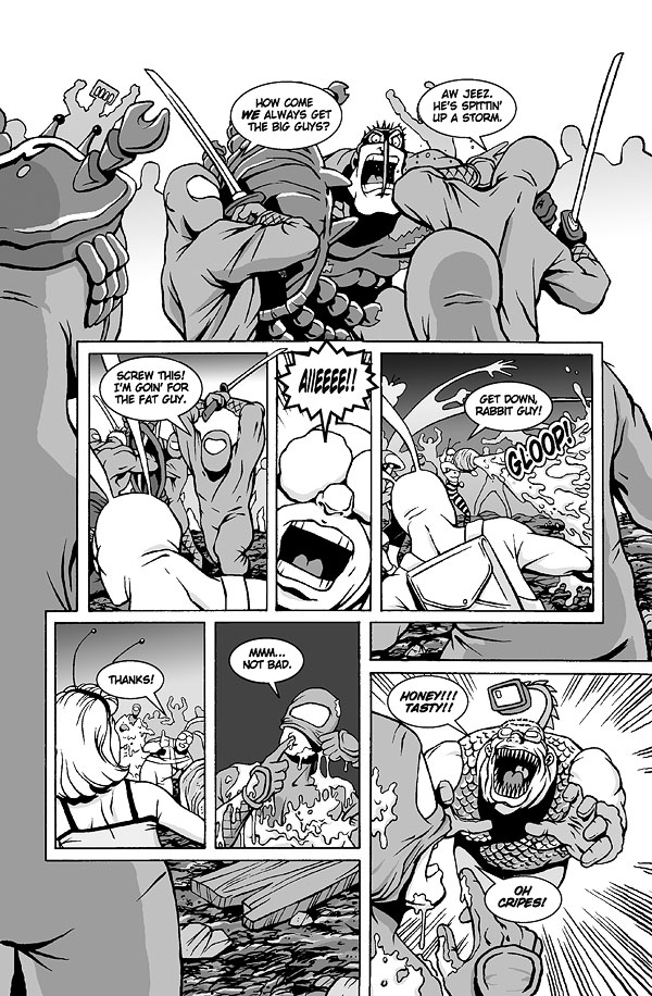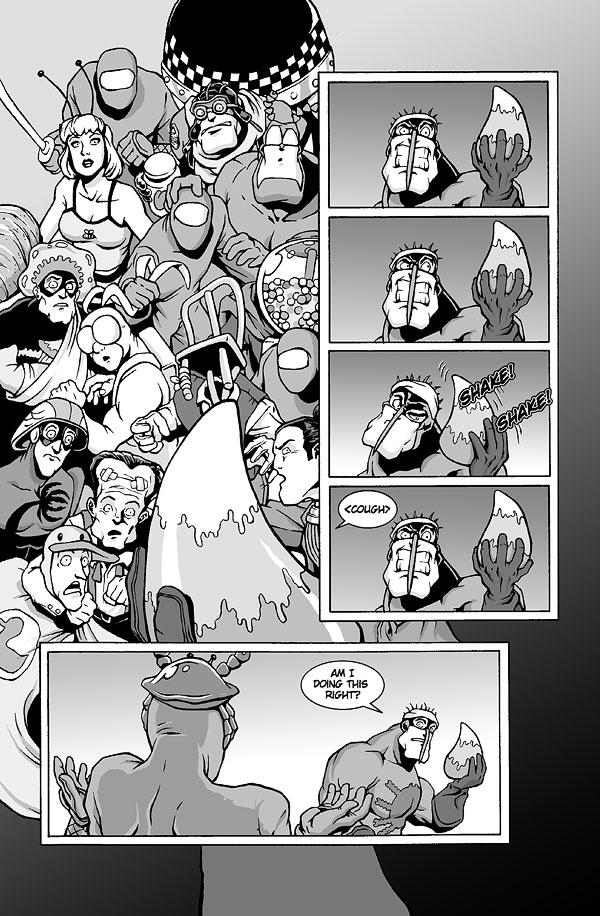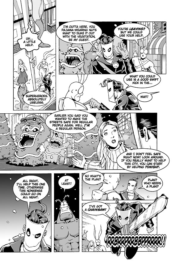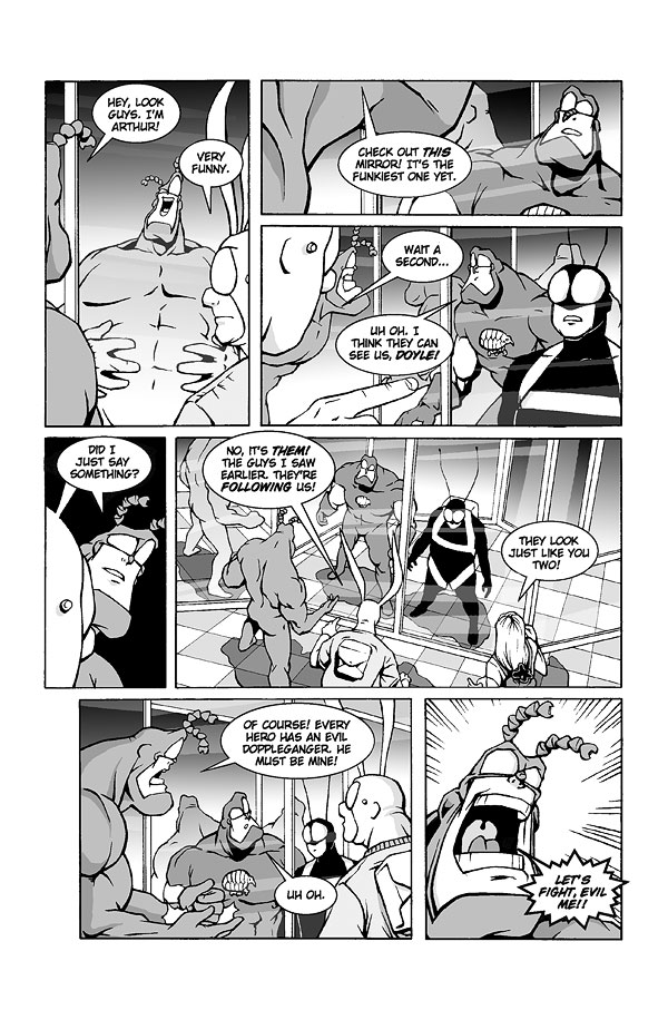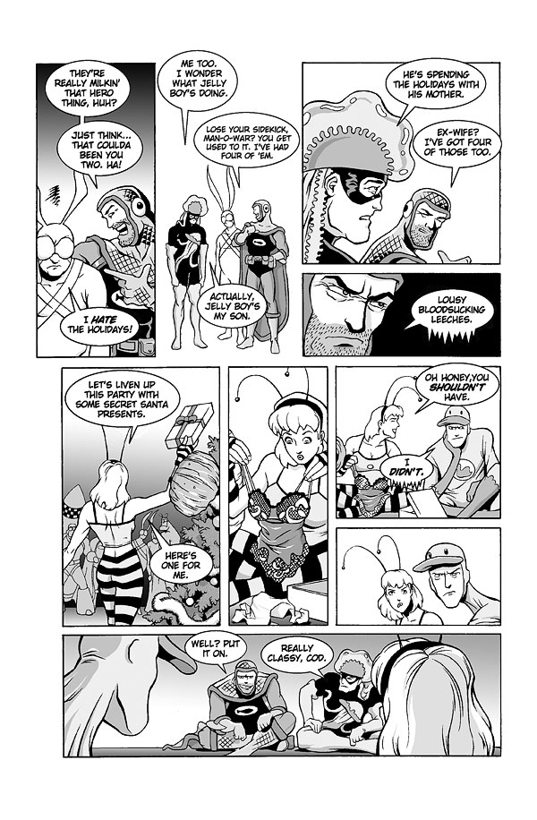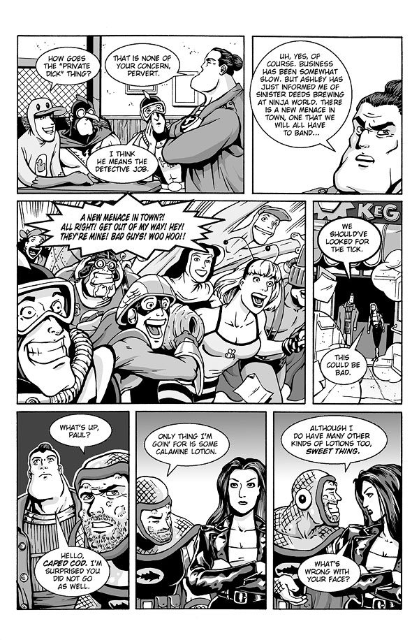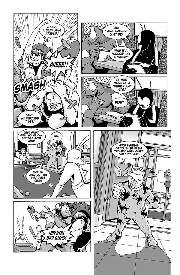 In 1999, I moved on to the six-issue Tick & Arthur series, where I was able to play with longer narratives and more story continuity (although even the seasonal specials had plot elements that all tied together). I added grayscale to the art to help flesh out the black-and-white look of the book, a look that eventually carried over to the first Runners series. I still love the work I did on Tick & Arthur, since I think the stories and art are a lot of fun and also add some layers to the Tick universe.