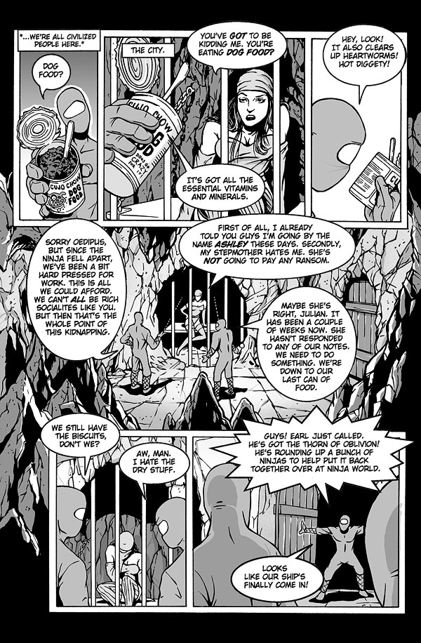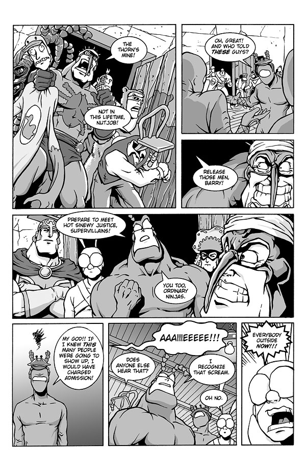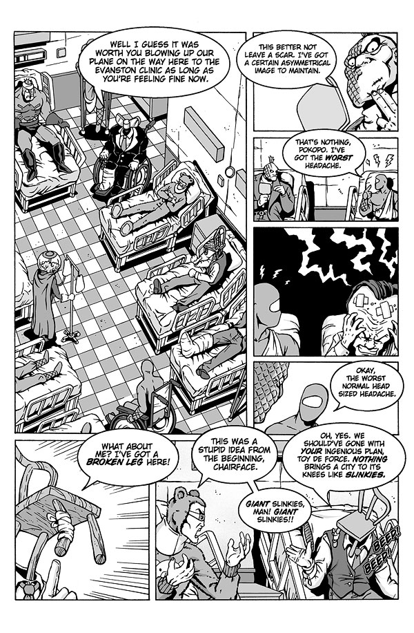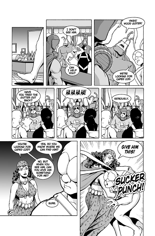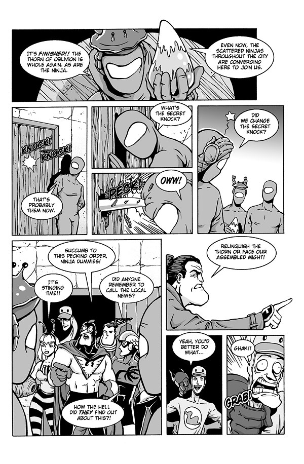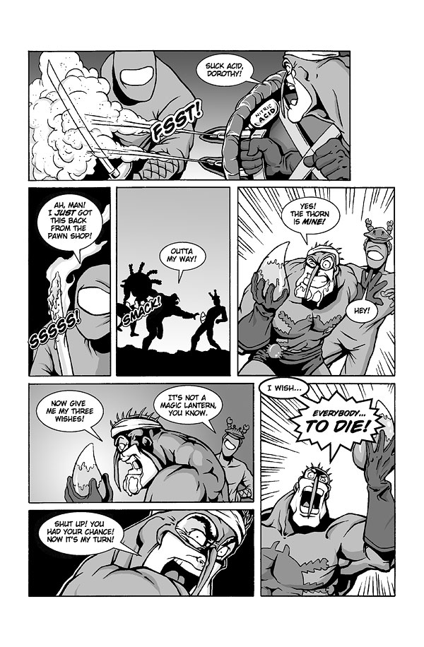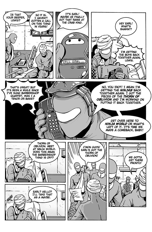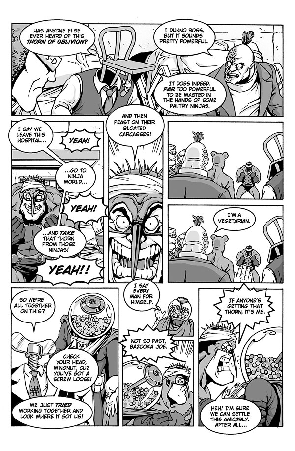 In 1999, I moved on to the six-issue Tick & Arthur series, where I was able to play with longer narratives and more story continuity (although even the seasonal specials had plot elements that all tied together). I added grayscale to the art to help flesh out the black-and-white look of the book, a look that eventually carried over to the first Runners series. I still love the work I did on Tick & Arthur, since I think the stories and art are a lot of fun and also add some layers to the Tick universe.