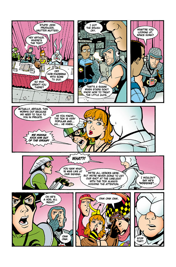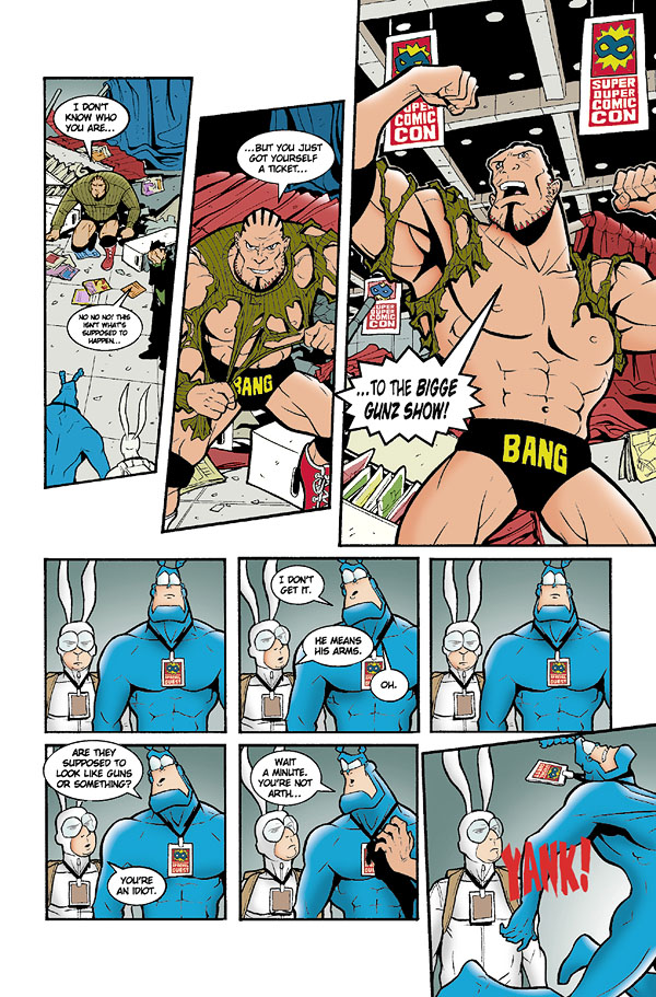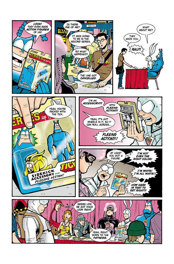 I stopped doing full Tick comics in 2000 to start work on my sci-fi project, Runners. Since then, I’ve continued to do covers for various Tick books, as well as content for the Circus Maximus series. In 2007, I returned to the Tick universe to contribute a short story to the Tick 20th Anniversary Special. I also wrote and drew my first full issue since 1999, The Tick Comic Con Extravaganza!