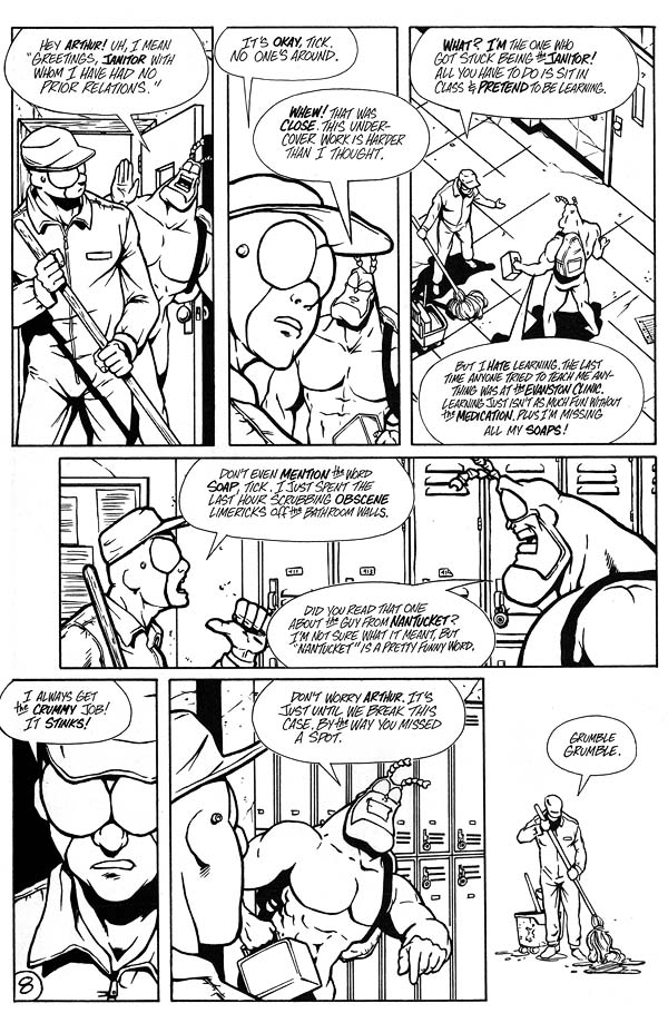 In 1999, I moved on to the six-issue Tick & Arthur series, where I was able to play with longer narratives and more story continuity (although even the seasonal specials had plot elements that all tied together). I added grayscale to the art to help flesh out the black-and-white look of the book, a look that eventually carried over to the first Runners series. I still love the work I did on Tick & Arthur, since I think the stories and art are a lot of fun and also add some layers to the Tick universe.